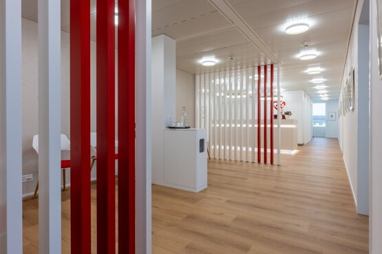 Wir entschieden uns, die Wände in einem sanften weiss zu streichen, um den Räumen eine helle und luftige Ausstrahlung zu verleihen. Ein kräftiges Rot wurde strategisch platziert, um Energie und Dynamik zu vermitteln – Eigenschaften, die besonders in einer Kardiologie-Praxis wichtig sind. Diese roten Elemente sollten nicht nur auffallen, sondern auch ein Gefühl von Vitalität und Lebensfreude ausstrahlen.