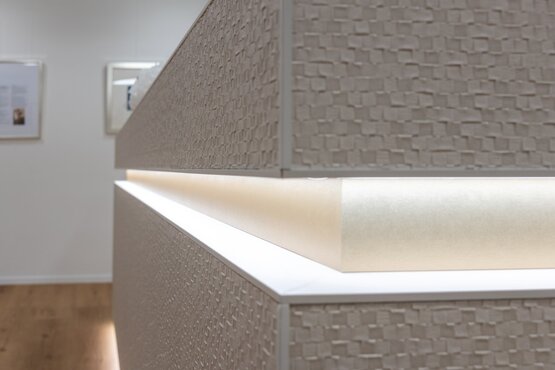 Der Empfangsbereich wurde mit einer eleganten Rezeption ausgestattet, die mit der gleichen strukturierten Tapete, wie an den Wänden gestaltet wurde. Eine Herausforderung für den Schreiner. Bequeme Sitzgelegenheiten mit Sitzkissen in Rottönen laden die Patienten zum Verweilen ein. Stilvolle Kunstwerke an der Wand – abstrakte Darstellung des Herzens – ziehen sofort die Blicke auf sich und setzen einen eindrucksvollen Akzent. Diese Bilder wurden von einem pensionierten Kollegen der beiden Kardiologen extra für die Praxis angefertigt.